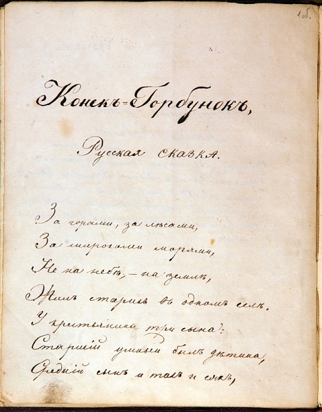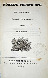 Иллюстрации: Репродукция с портрета П.П.Ершова, 1840-е годы (?). ТИАМЗ; Первый лист белового автографа сказки «Конёк-Горбунок», сделанный рукой П.П.Ершова. РГАЛИ; Разворот 5-й книжки журнала «Библиотека для чтения» с первой публикацией первой главы сказки; Запись о цензурном разрешении полного издания сказки и выдаче билета на печатание. РГИА; «Конёк-Горбунок». 1-е издание. Санкт-Петербург, сентябрь 1834 г. РНБ.