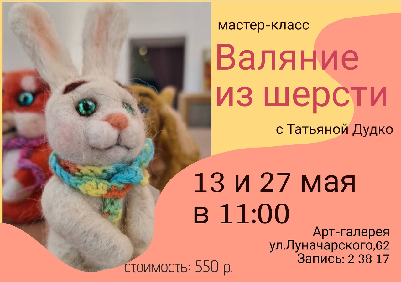 Арт-галерея приглашает взрослых и детей от 7 лет на мастер-классы по валянию игрушки из шерсти с Татьяной Дудко.