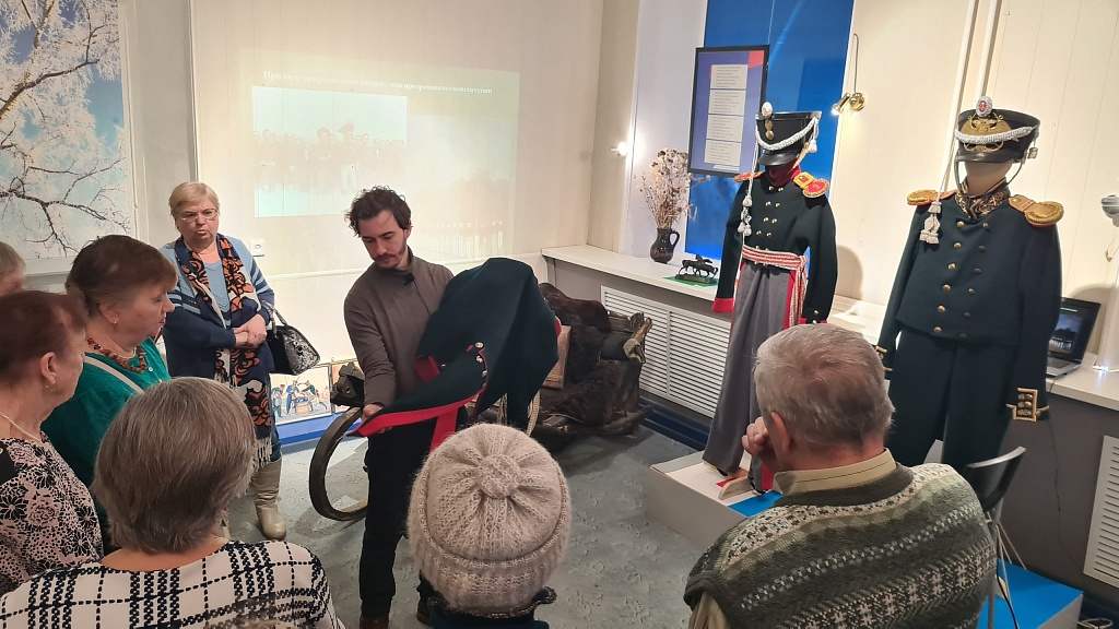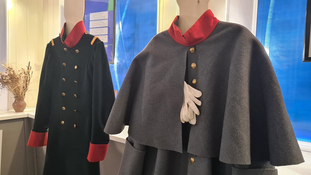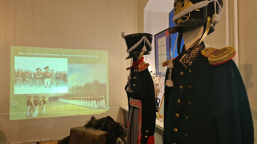 На выставке представлены копии мундиров, головных уборов, а также шинель и сюртюк, которые использовались на протяжении первой половины 19 века.