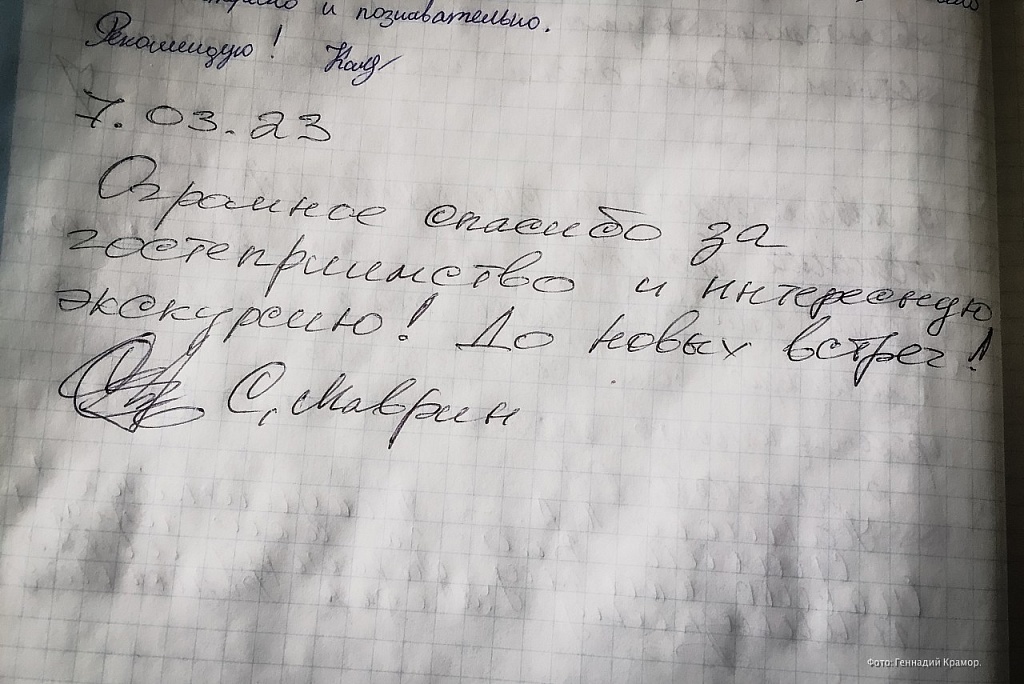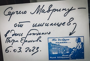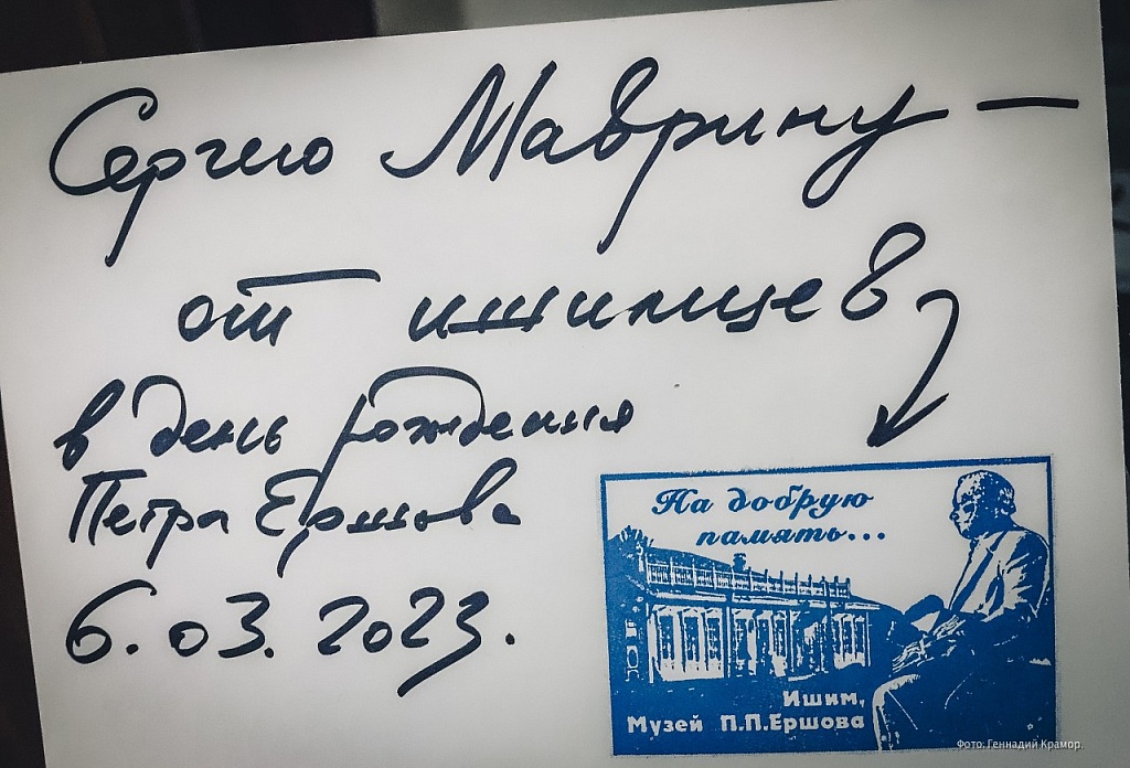 Сергей Маврин выступил во дворце культуры с инструментальным концертом. Этот концерт стал большим музыкальным подарком для ишимцев, за что огромная благодарность его устроителям. А поскольку это случилось 6 марта 2023 года, в день рождения Петра Павловича Ершова, то никак нельзя было отпустить Сергея Константиновича без небольшого подарка - почтовой карточки с юбилейным гашением. На следующий день Сергей с друзьями посетил наш музей, внимательно выслушал рассказ об истории нашего города и оставил памятную запись. Приятно встречать таких интеллигентных и талантливых гостей в Ишиме, надеемся на новые встречи!