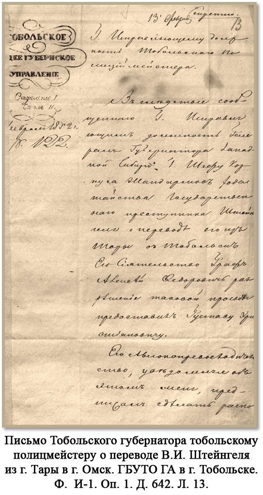- Во время пребывания в Тобольске Штейнгель напечатал несколько небольших статей в журнале «Маяк» под псевдонимом Тридечный. Когда в 1842 г. начались «картофельные бунты», тобольский губернатор Ладыженский просил Штейнгеля написать воззвание к народу с целью предостеречь его. Князю Горчакову не понравилось участие декабриста в делах управления губернией. И под предлогом его нежелательного влияния на губернатора Ладыженского, в связи с его давним знакомством с женой губернатора, Штейнгеля отправили в Тару, где он провел 8 лет. Последние же четыре года до амнистии жил в Тобольске «имея утешительную надежду, что руки товарищей несчастья после смерти закроют ему глаза».